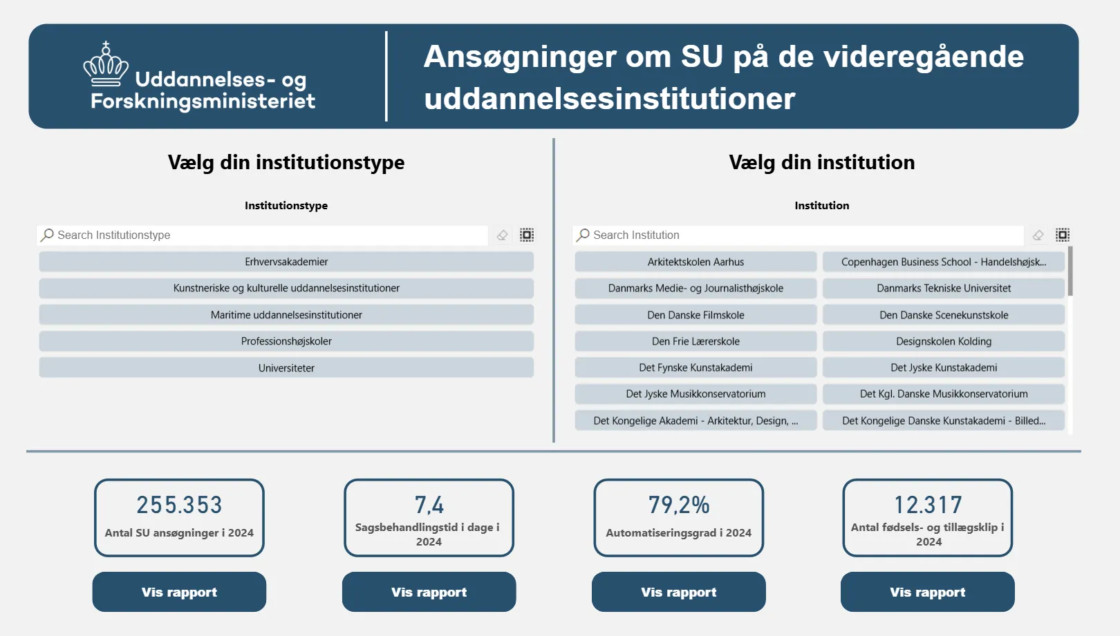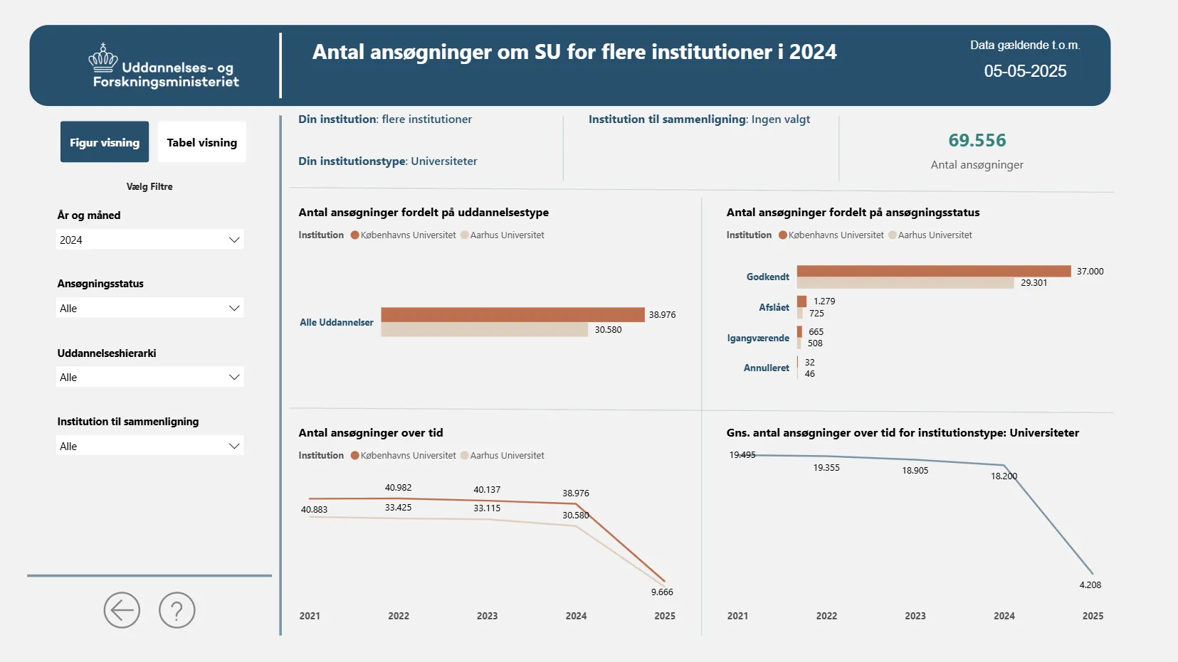 Rapporten viser antallet af ansøgninger om SU. Du kan se, om antallet af ansøgninger ændres over tid, og hvordan sagerne behandles.