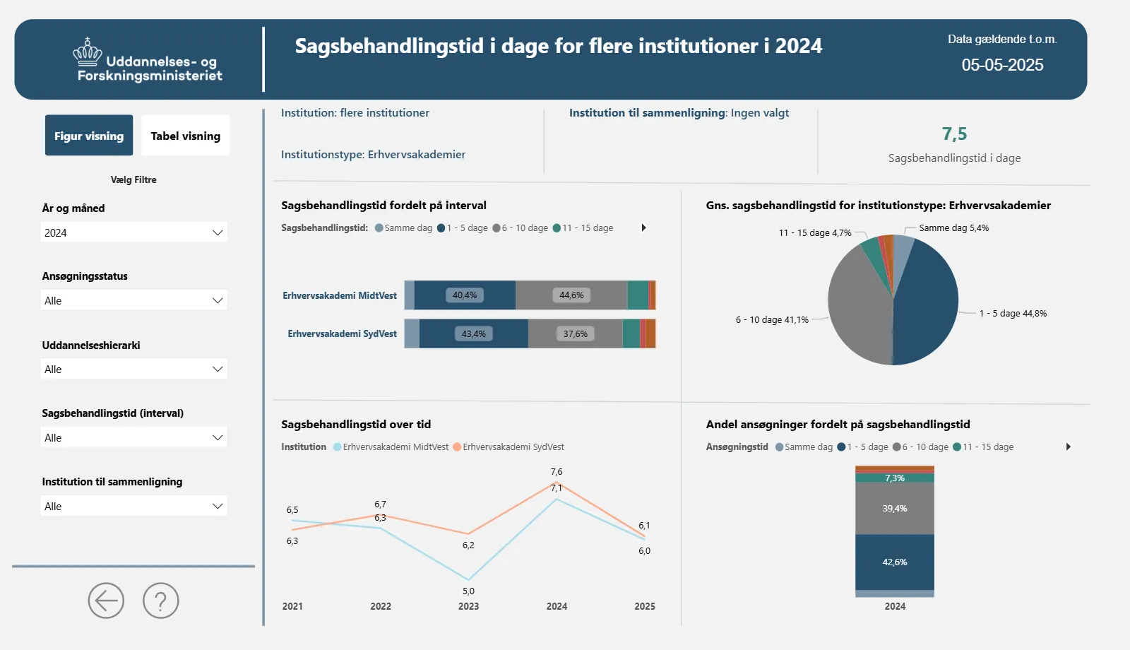 Nedenstående rapport viser sagsbehandlingstider for ansøgninger. Rapporten kan bruges til at forklare forskelle i sagsbehandlingstider ved at se nærmere på andelene af de forskellige intervaller. Du kan sammenligne data for jeres institutions med andre institutioners og vurdere, om jeres sagsbehandlingstider virker passende.