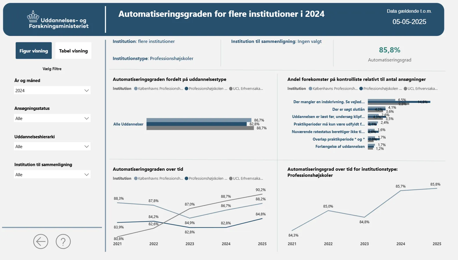 Denne rapport viser automatiseringsgraden. Automatiseringsgraden viser, hvor stor en andel af ansøgninger, der ikke kommer på en kontrolliste. Denne rapport kan bruges til at se om automatiseringen ligger på et passende niveau, og hvis der er uoverensstemmelser om kontrollisteforekomsterne skyldes noget, der kan rettes på jeres institution.