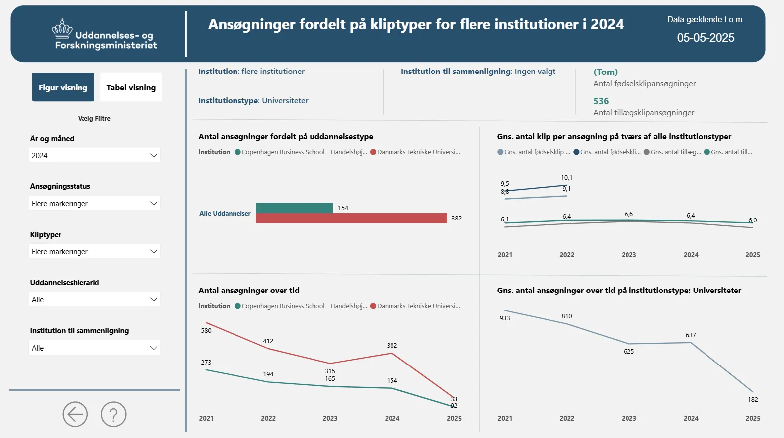 Denne rapport viser antallet af ansøgninger om tillægsklip og fødselsklip og udviklingen over tid. Du kan eventuelt sammenlignelige antallet af ansøgninger på tværs af institutioner.