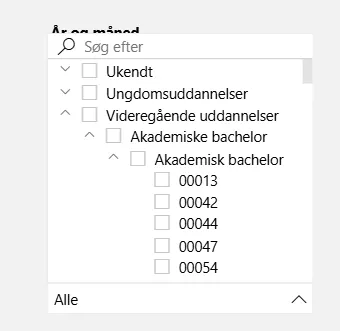 Filteret for uddannelseshierarki kan vise data i rapporten på retningskode-niveau. Vær opmærksom på, at du skal klikke ned igennem hierarkiet for at finde retningskoderne, og at retningskoderne er med foranstillede nuller (dvs. at retningskode "153" står som "00153").